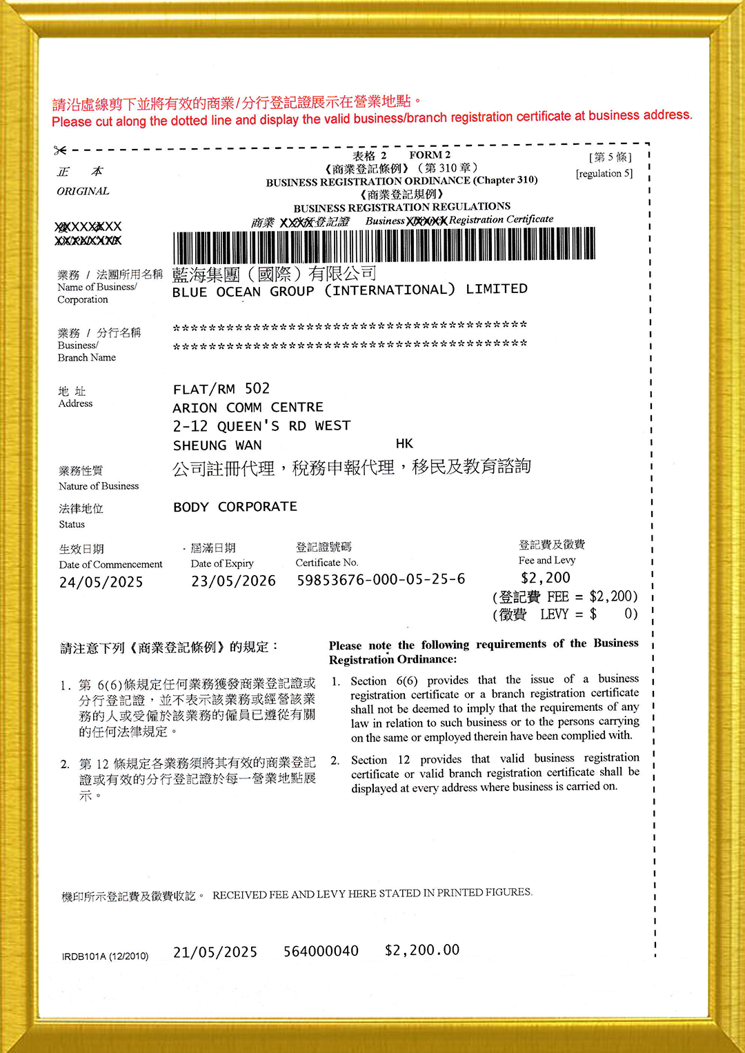 香港蓝海、深圳蓝海一体化,香港政府特准持牌秘书公司(牌照号:TC004412)